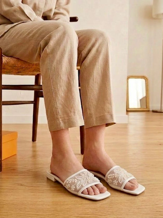 Z-A-R-A Embroidered Pearl Flat Slippers – Elegant Women Footwear (White)