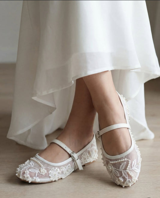 Z-A-R-A Net Pearl Embroidered Flats – Elegant Women Footwear (White)