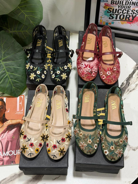 Z-A-R-A Net Pearl Embroidered Flats – Elegant Women Footwear (Green/Beige)
