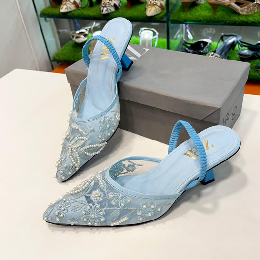 ZARA Mesh Floral Embroidered Slingback Women’s High Heels (Sky Blue)