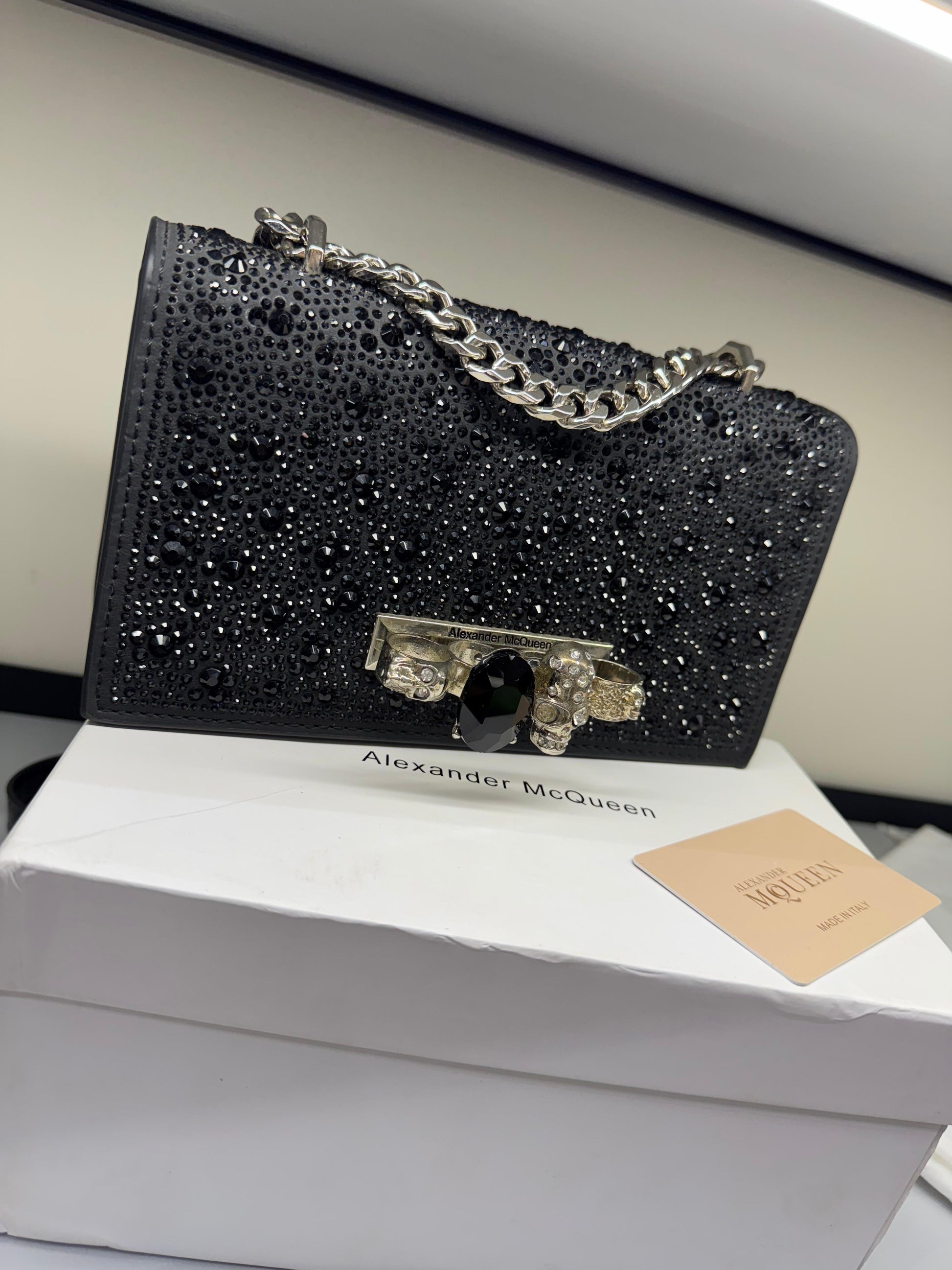 • Make a bold statement with the Alexander McQueen Crystal-Embellished Mini Jewelled Satchel. Crafted from premium leather and crystals, this luxury bag features the iconic skull jewel knuckle duster and a versatile sliding chain-and-leather strap. Perfect for evening events or elevating your everyday style, it’s a true symbol of edgy sophistication.