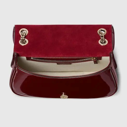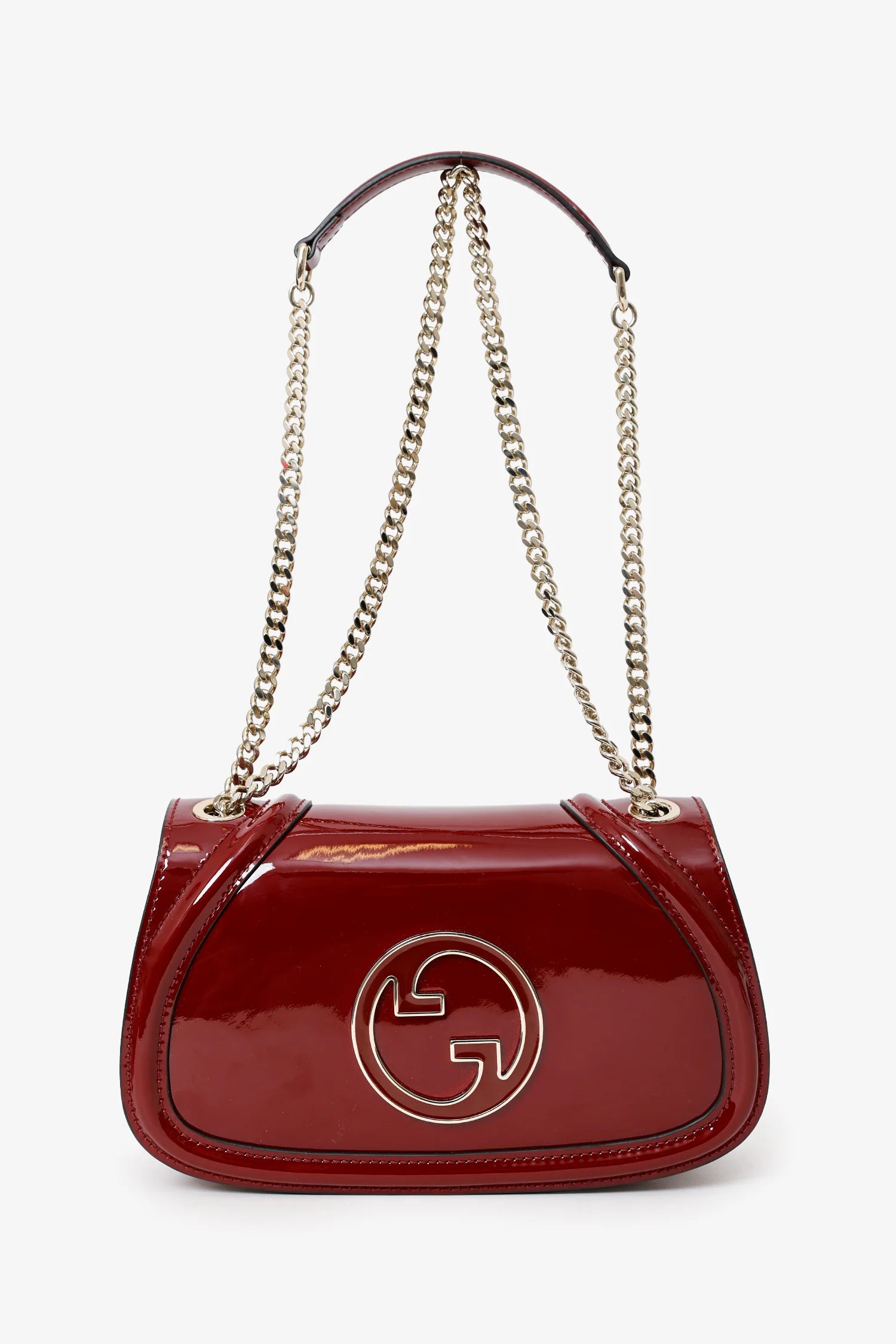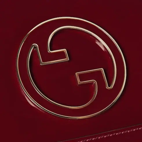 The G-U-C-C-I Blondie Small Shoulder Bag in Rosso Ancora Red Patent is a striking women bag that combines glamour, elegance, and modern luxury. Crafted from glossy patent material in a rich burgundy-red tone, this statement bag features the iconic round Gucci emblem and a stylish gold-toned chain strap, making it perfect for both daytime and evening looks.