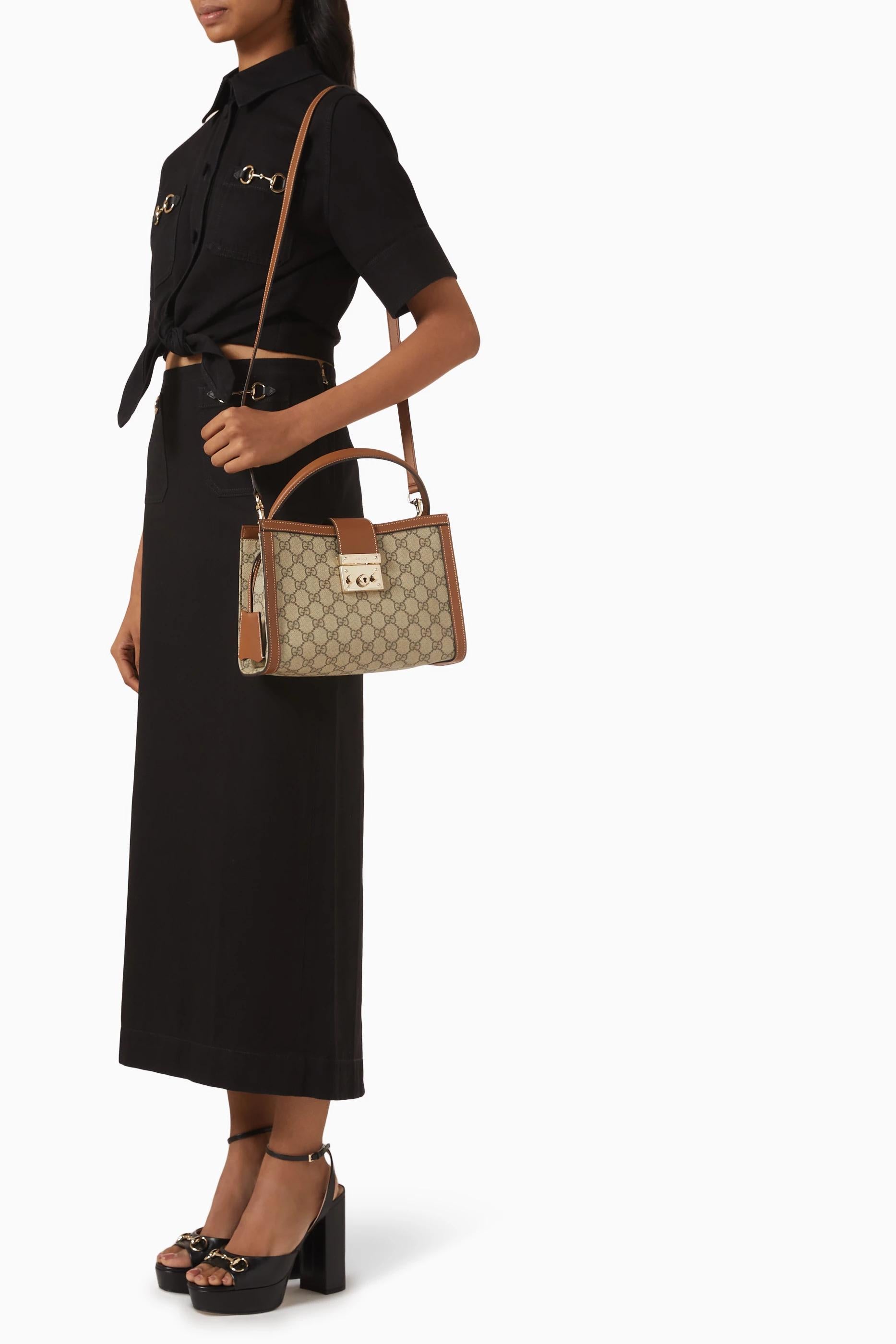 The G-U-C-C-I Padlock Medium Top Handle Women Bag is a timeless luxury piece designed for elegance and structure. Featuring the iconic monogram coated fabric with rich brown leather trim and light gold-toned hardware, this women bag is perfect for both formal and elevated everyday styling.