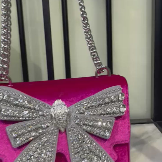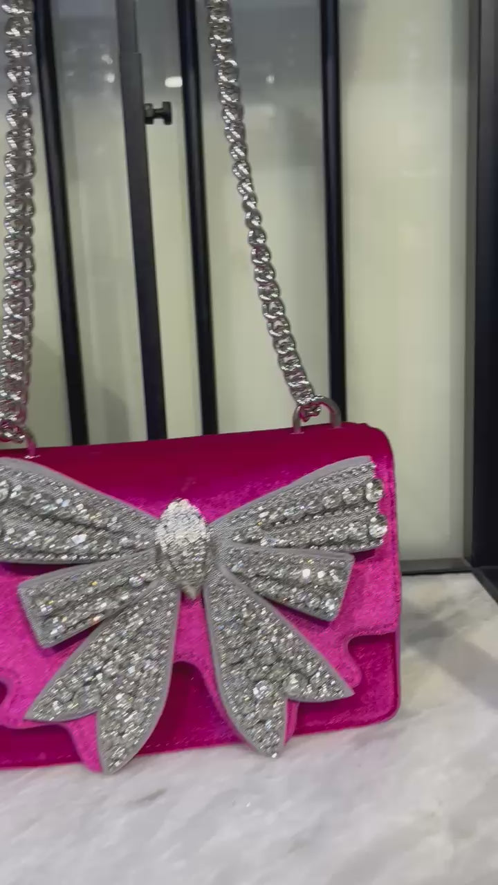 The KURT GEIGER Small Shoreditch Bow Women Bag is a dazzling statement piece that blends glamour with sophistication. Featuring a crystal-embellished bow adorned with the brand’s signature silver eagle head, this bag is designed to turn heads. Compact yet functional, it offers versatile styling with its silver chain strap and thoughtfully designed compartments.